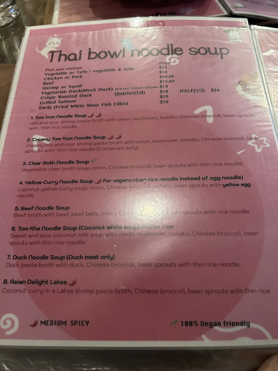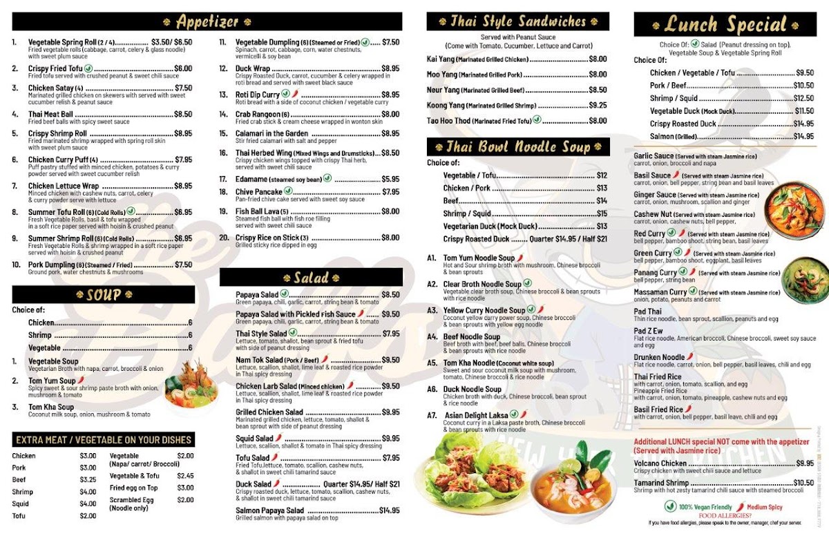 Many of the menu choices invite you to enjoy the comforting warmth of noodle soups or the vibrant crunch of fresh Thai-style salads. For those moments when you want something light yet satisfying, dishes like the Summer Tofu Roll or Crispy Duck Wrap offer a refreshing contrast. Sweet endings come through simple, classic treats such as Mango Sticky Rice, perfect for rounding out your meal on a gentle, sweet note.